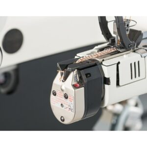 W maszynie zastosowano sensor wykrywający zgrubienia na materiale (szwy poprzeczne) i sterujący dociskiem stopki, dzięki czemu uzyskujemy najwyższej jakości przeszycie bez ryzyka przepuszczania szwów. Dodatkowo maszyna wyposażona jest w elektroniczny wydajny paskowy puller wspomagający transport materiałów.